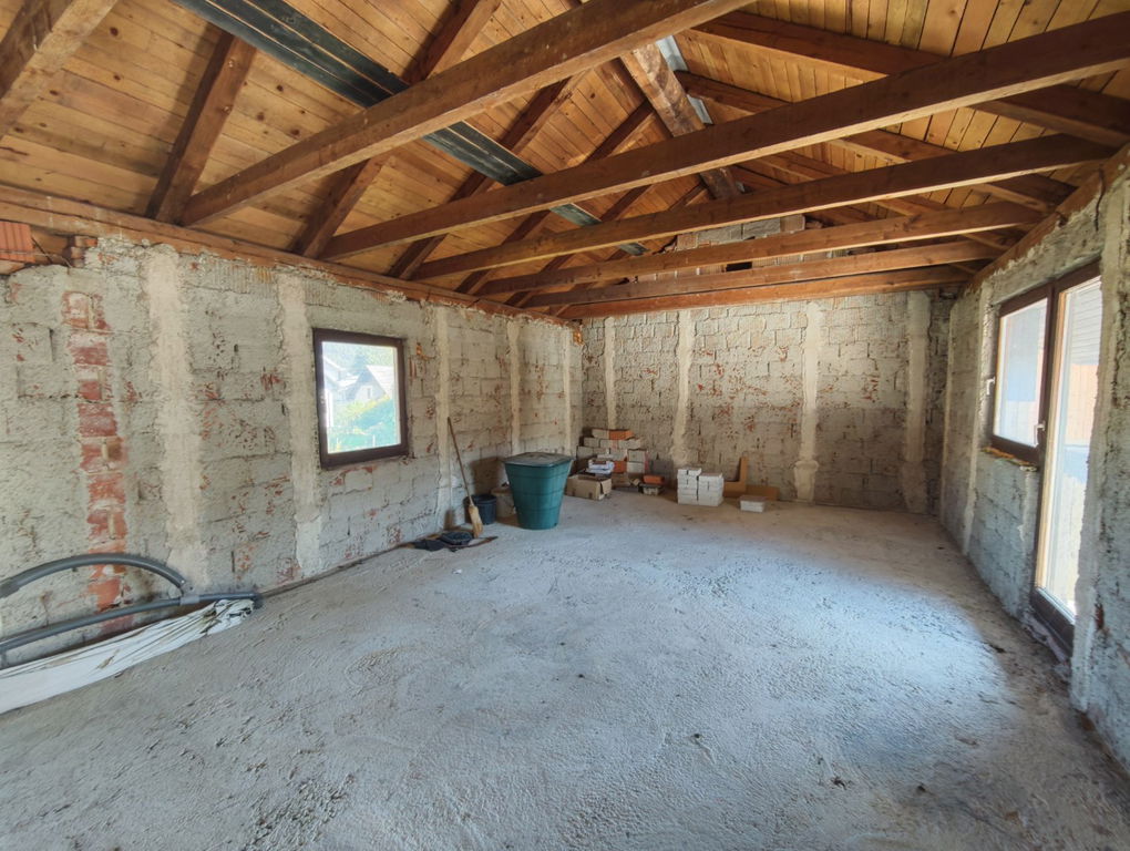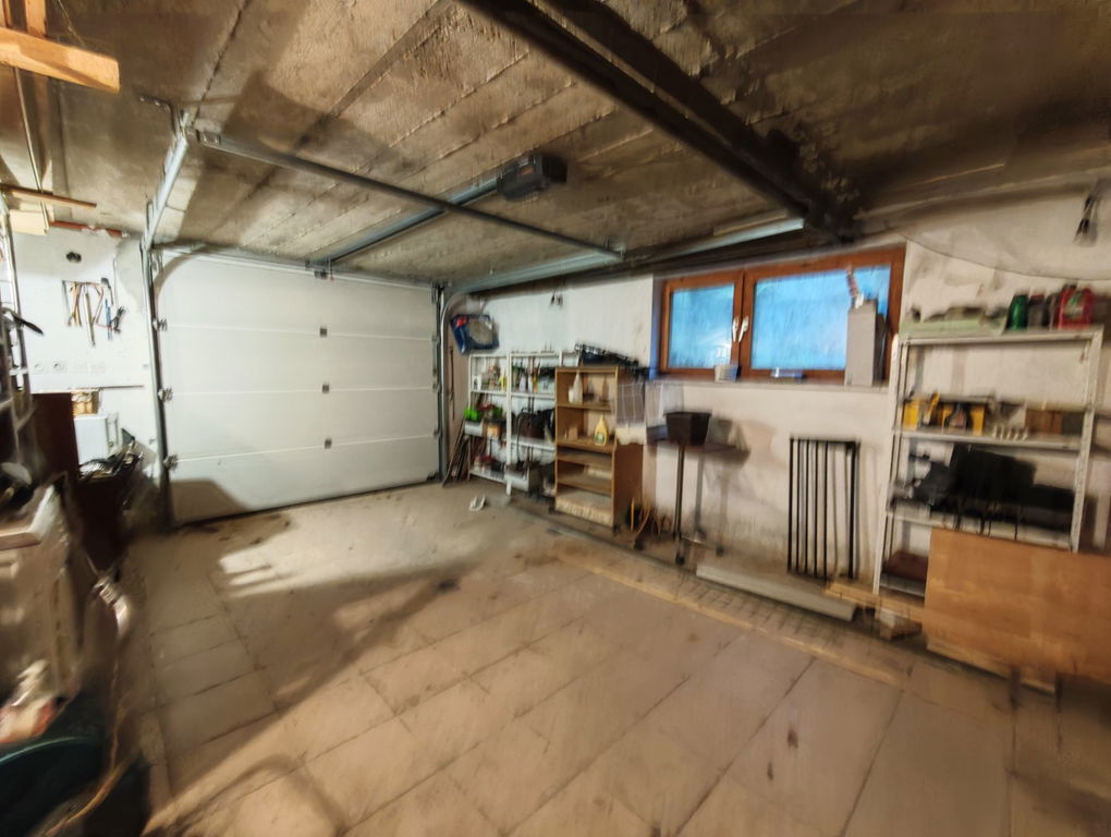 Ob hiši se nahaja garaža za dve vozili, nad katero je velik prostor, primeren za preureditev v manjše stanovanje, atelje ali delavnico.