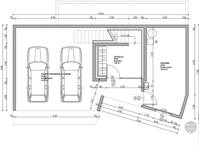 Klet: pokrita garaža 44,16 m2, vetrolov 7,85 m2 in shramba 19,64 = skupaj 71,65 m2