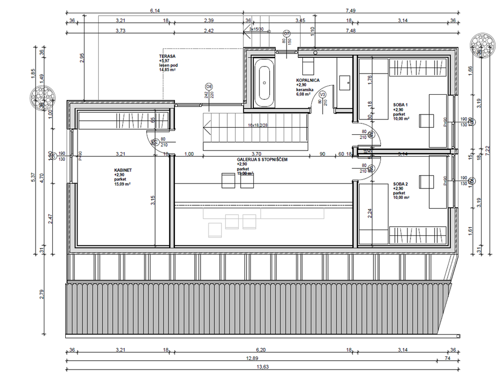 Mansarda: galerija s stopniščem 19,90 m2, kopalnica 6,08 m2, soba 1 10 m2, soba 2 10 m2, kabinet 15,09 m2 = skupaj 61,07 m2+terasa 14,85 m2.