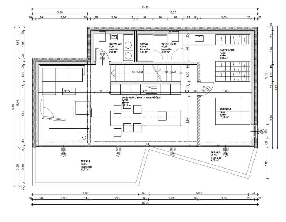 Pritličje: dnevni prostor s kuhinjo in stopniščem 45,18 m2 z izhodom na veliko teraso 13,27 m2, spalnica 13,54 m2, garderobna soba 8,62 m2, dnevni wc 4,01 m2, savna 1,48 m2, wc s tušem 3,01 m2 = skupaj 75,84 m2 + terasa 13,27 m2