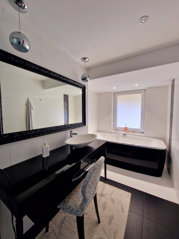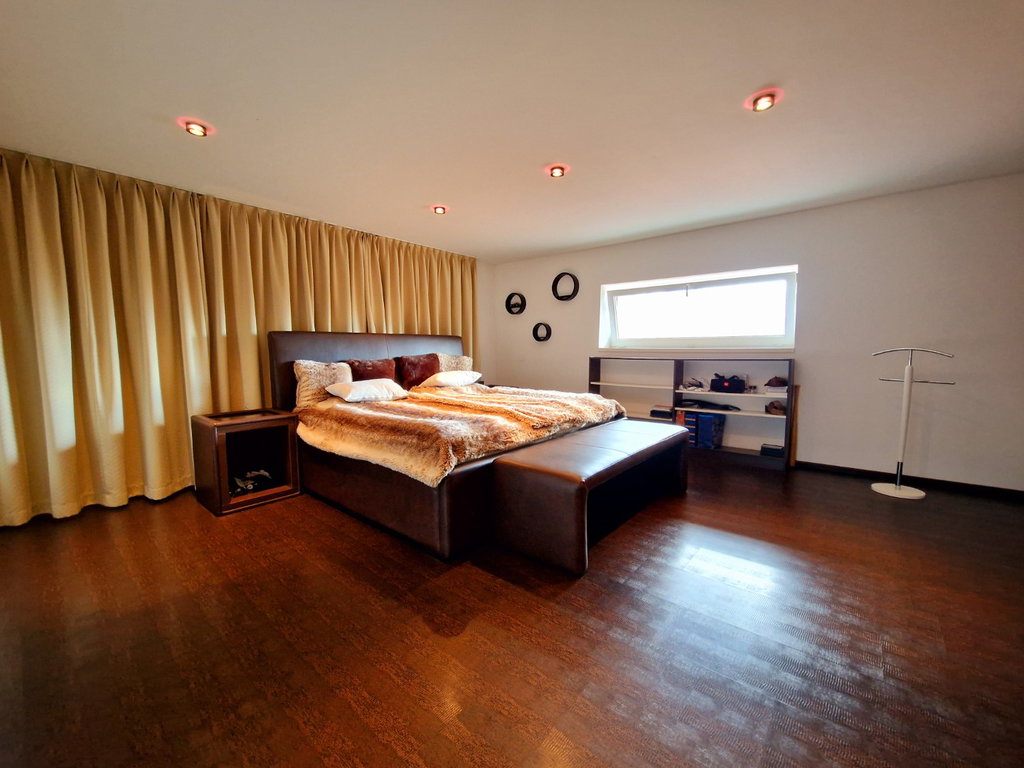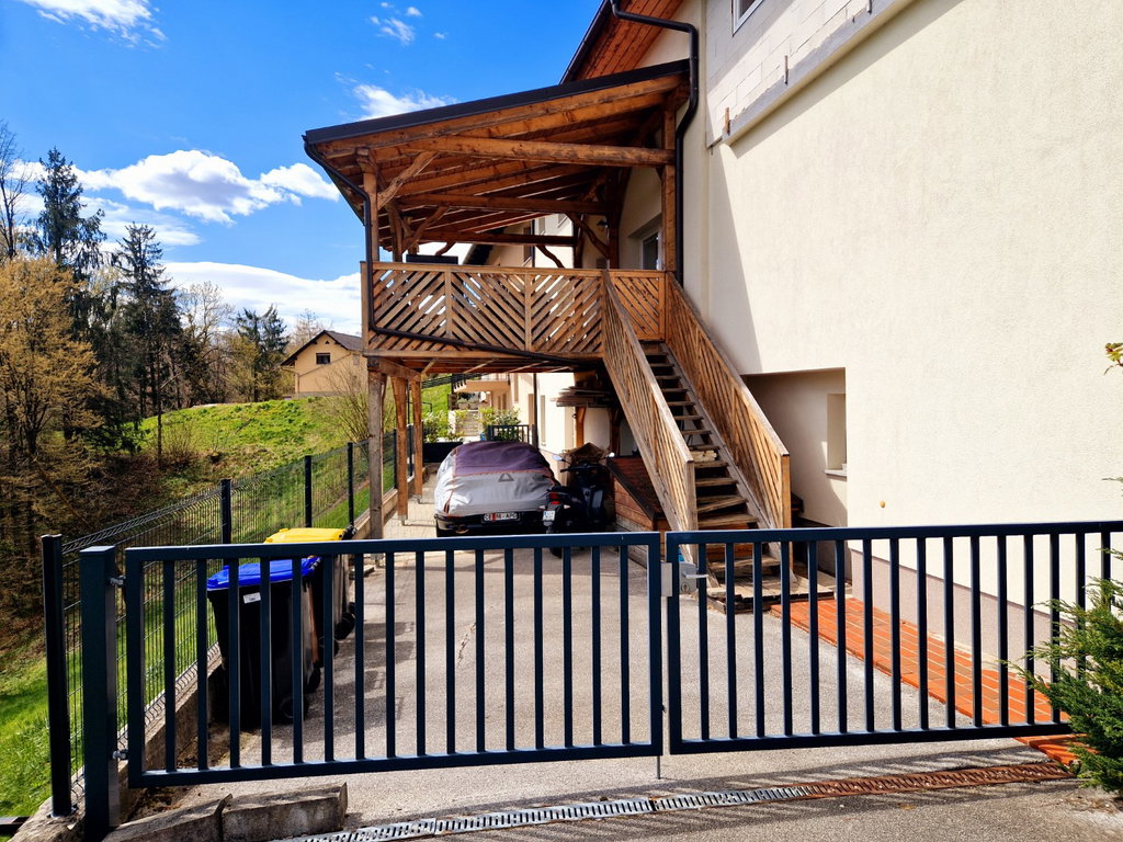 Hiša etažnosti K+P+1 meri 281,6 m2 brtuo površine. Pritličje obsega dve garaži z daljinskimi dvižnimi vrati, hodnik z vgradno garderobno omaro in stopniščem, ki vodi v nadstropje, zelo prostorno dnevno sobo, jedilnico z izhodom na nadkrito leseno teraso, kuhinjo in kopalnico. V nadstropju se nahajata dve manjši in ena velika spalnica, dve kopalnici, vgradna garderobna omara na hodniku in dodaten prostor velikosti 43 m2 s savno in predvidenim fitnesom. Klet obsega kurilnico s shrambo, utility in dodatno prostorno shrambo.
