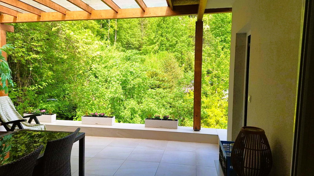 Stanovanje se nahaja na robu gozda in meri 173,5 m2 od tega 140 m2 neto uporabne površine, 5,4 m2 sušilnica/pralnica, odprta terasa v izmeri 20,1 m2 in shramba v pritličju v izmeri 8 m2. Stanovanje obsega funcionalen in dolg hodnik, ki povezuje bivalne in spalne prostore, utility, dve kopalnici (ena še ni v celoti izdelana), tri spalnice, prostoren in izredno sončen dnevni prostor s kuhinjo in jedilnico, z odprtim pogledom na okolico. Iz kuhinje je izhod (vrata Pirnar) na veliko in pokrito teraso, ki je obdana z zelenjem in nudi obilo zasebnosti. Do stanovanja, ki ima lastni vhod (vrata Pirnar na prstni odtis), se dostopa po stopnišču. V pritličju je tudi shrambni prostor, ki je skupen s sosednjim stanovanjem. Vsakemu je na voljo 8 m2 površine. Pred stavbo sta na voljo dve parkirni mesti.