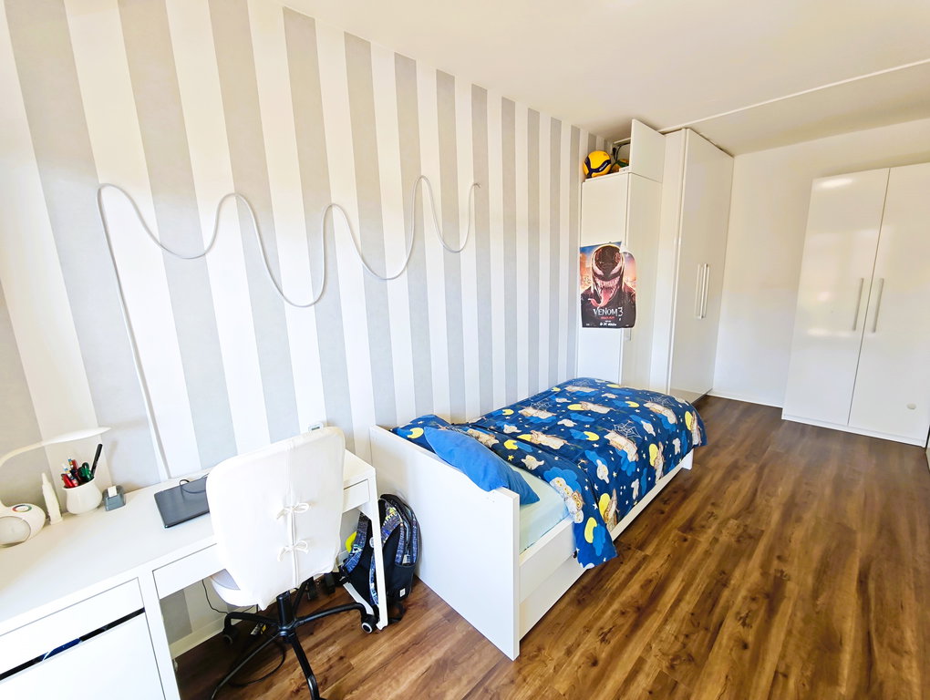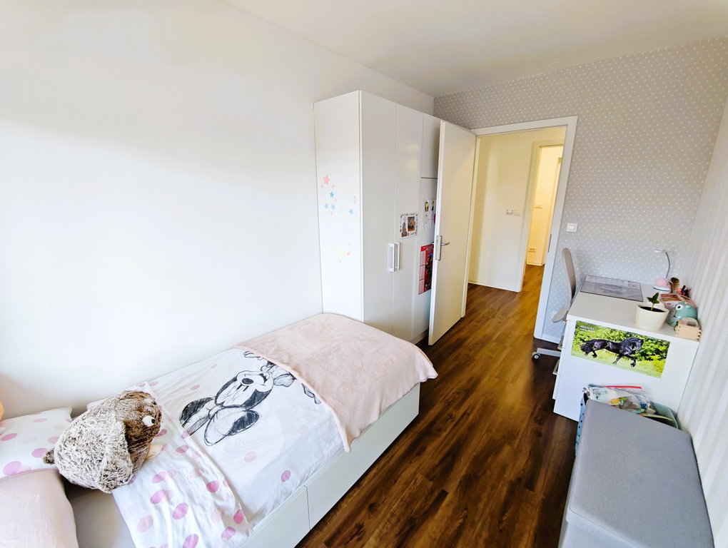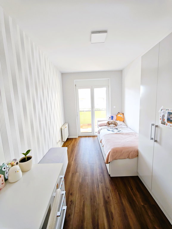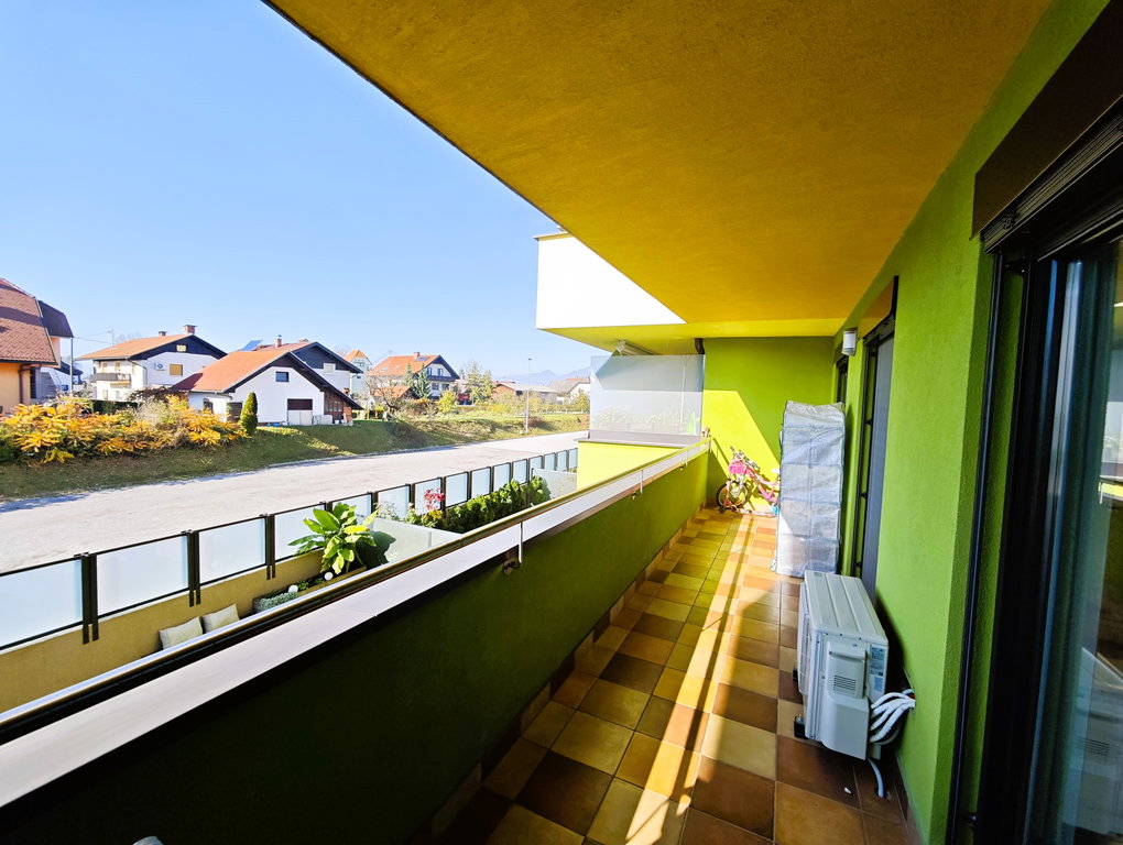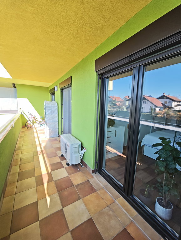 V nadstropju se nahaja dodaten vhod, kopalnica, hodnik z garderobno omaro, dve otroški sobi in zakonska spalnica z garderobno omaro. Vse sobe imajo izhod na prostoren balkon od koder sega lep pogled na hribe/Karavanke. Zaradi zahodne lege so vsi prostori zelo svetli.