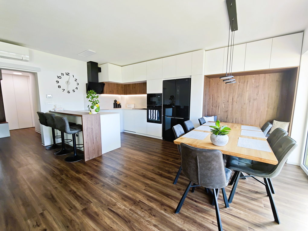 Stanovanje obsega pritličje in nadstropje in meri 218,50 m2 bruto ter 110,70 m2 neto površine. Vsaka etaža ima tudi svoj vhod. V pritličje se dostopa iz garaže, v nadstropje pa vodi samostojen vhod, ki ni vezan na večstanovanjski objekt. Stanovanje je vmesna enota med dvema večstanovanjskima objektoma, brez dodatnih stanovanj nad enoto, kar nudi dodatno zasebnost.