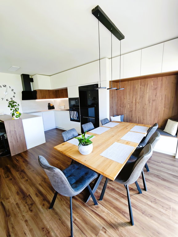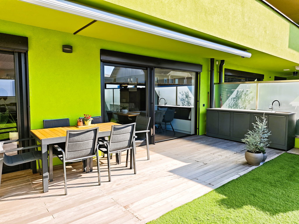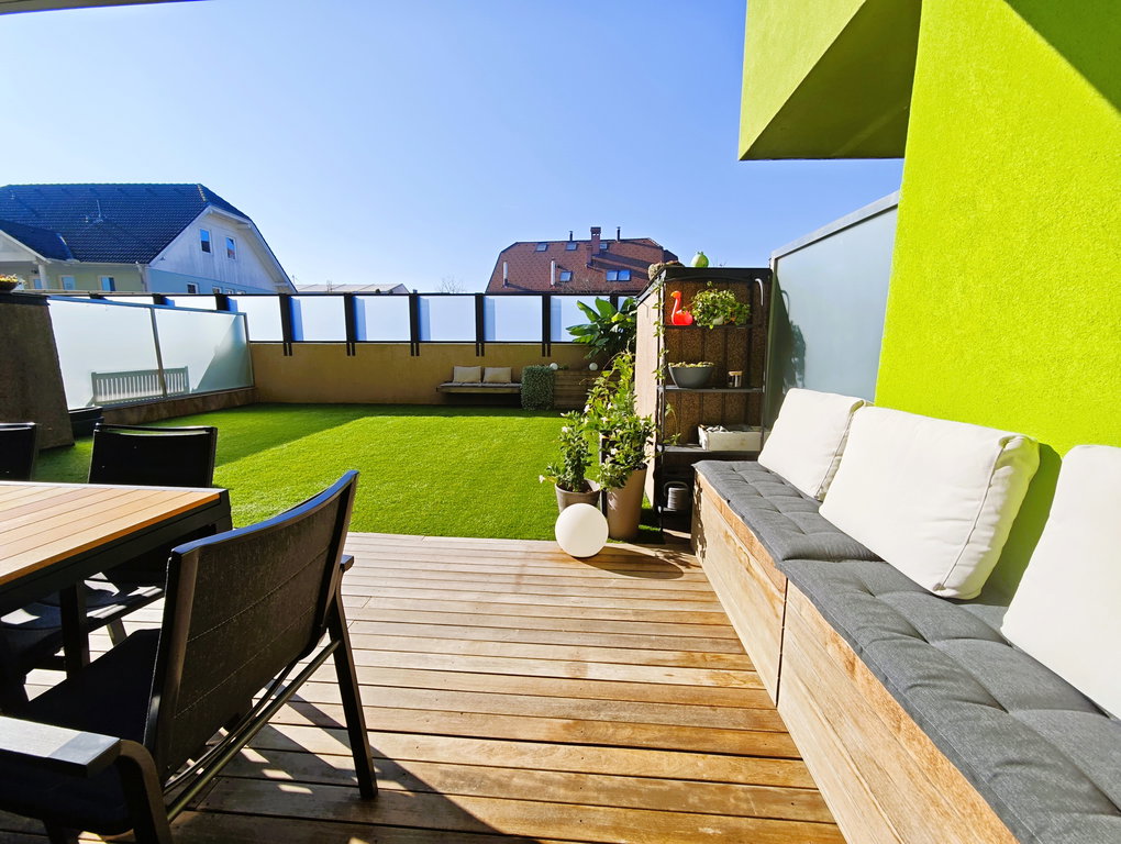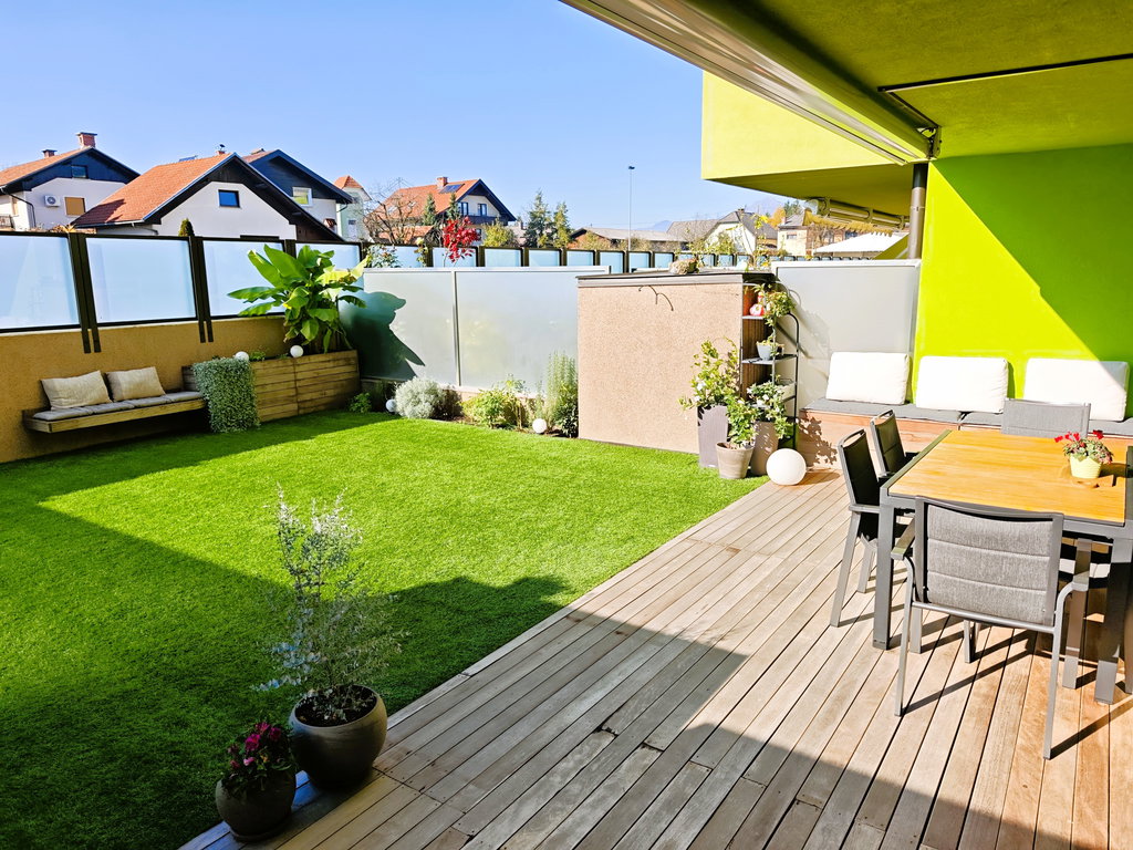 V atriju je bila položena nova umetna trava, na novo prekrita lesena terasa (Itauba dark), novo vrtna garnitura in prebarvan del fasade stavbe.