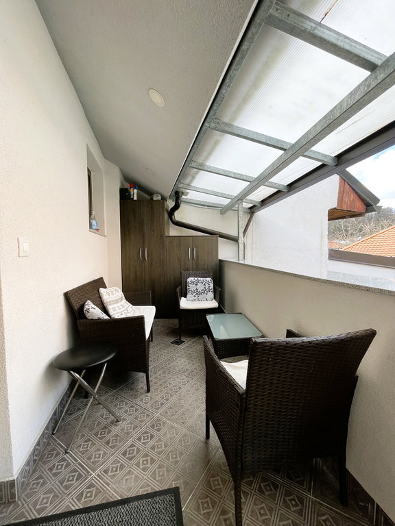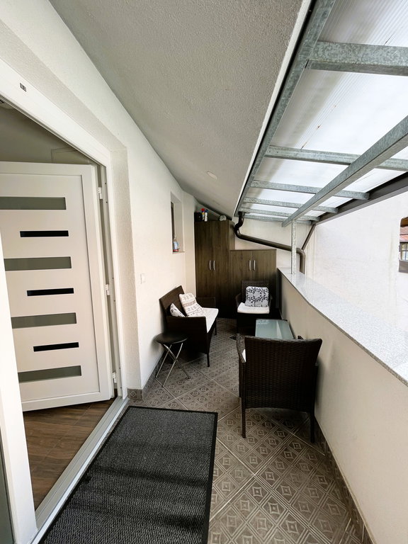 V stanovanje, ki ima lastni vhod se dostopa po stopnišču. Pred vhodom v stanovanje je manjši balkon, na katerem je dovolj prostora za druženje. Tri stopnice višje, pa nas pričaka velika in prostorna terasa, ki nudi popolno zasebnost. Terasa je delno pokrita in delno odprta. Na njej je dovolj prostora za žar, vrtno garnituro in zasaditev rož in drugega zelenja.