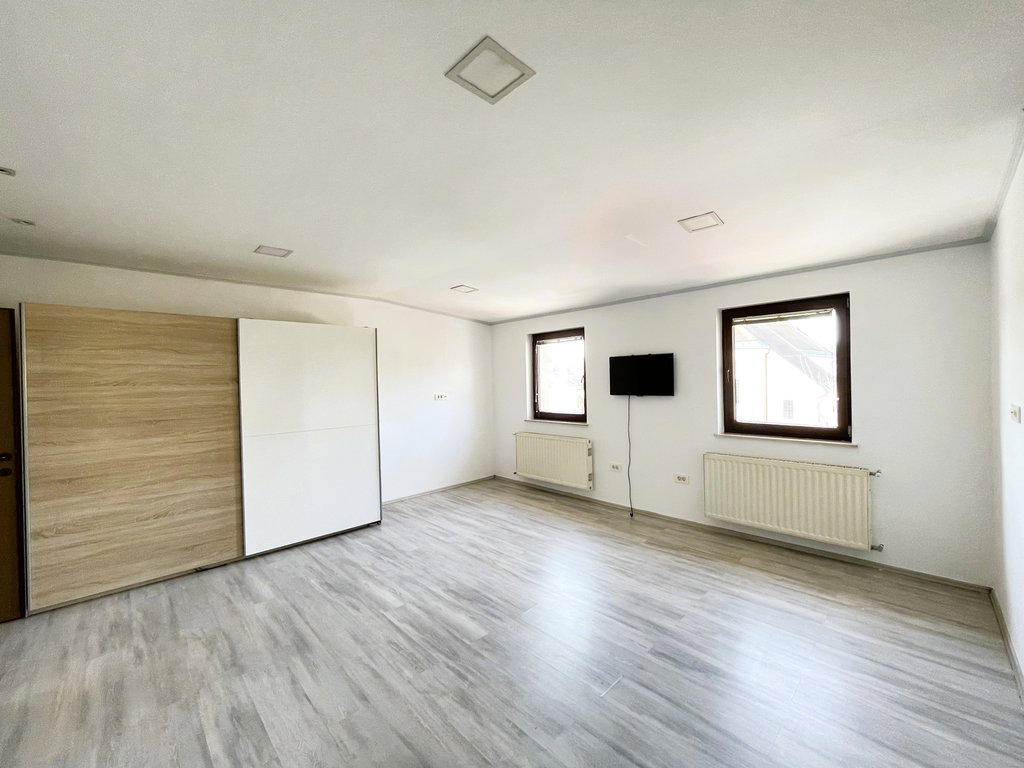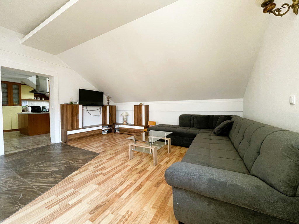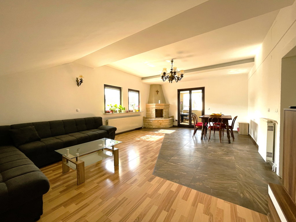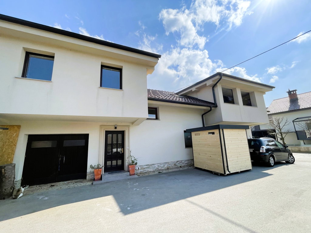 Stanovanje se nahaja v stanovanjski hiši z dvema ločenima stanovanjema v izmeri 180,6 m2 neto površine in 150,7 m2 uporabne površine (skupaj s teraso). Vsako stanovanje ima lasten vhod in določen lastniški prostor za parkiranje (za 3-4 avtomobile/stanovanje). Na koncu parcele je tudi lesena uta, prostor za drva in prostor za postavitev zunanje vrtne garniture.