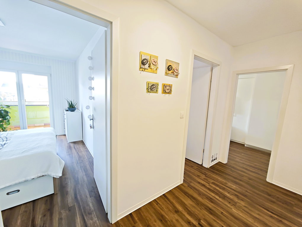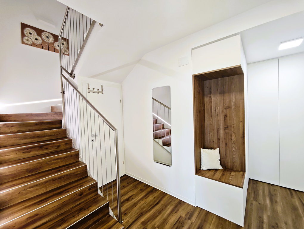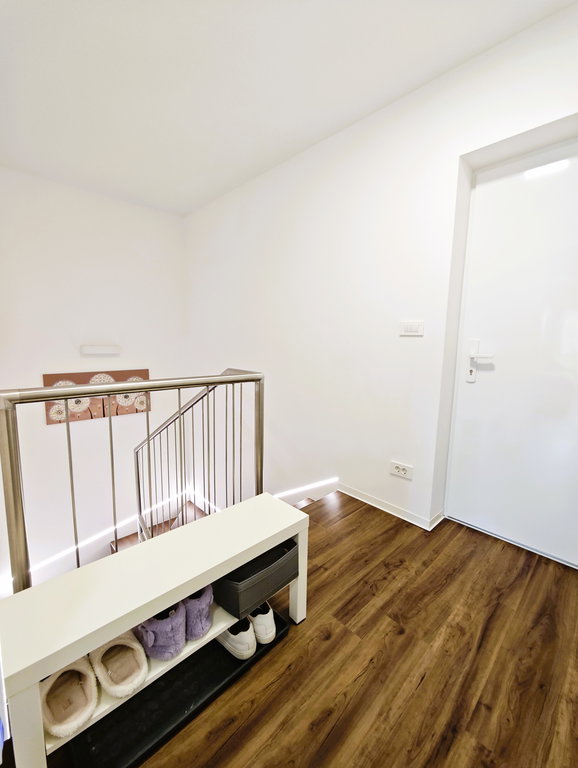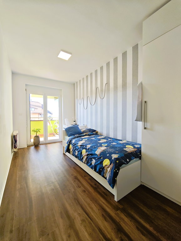 V nadstropju se nahaja dodaten vhod, kopalnica, hodnik z garderobno omaro, dve otroški sobi in zakonska spalnica z garderobno omaro. Vse sobe imajo izhod na prostoren balkon od koder sega lep pogled na hribe/Karavanke. Zaradi zahodne lege so vsi prostori zelo svetli.