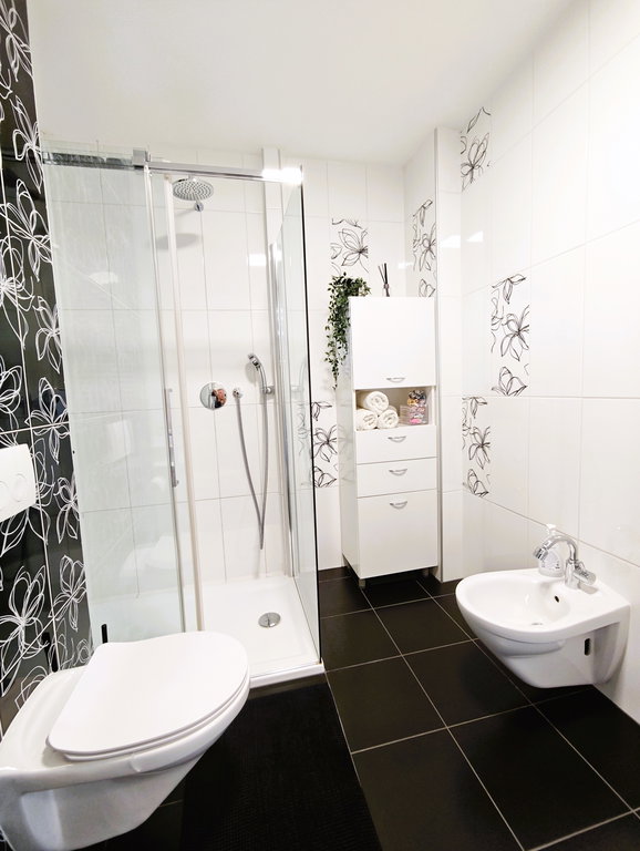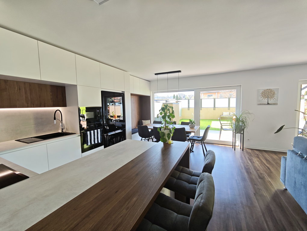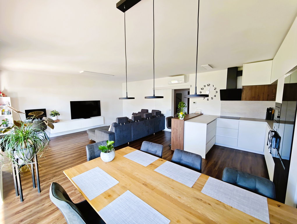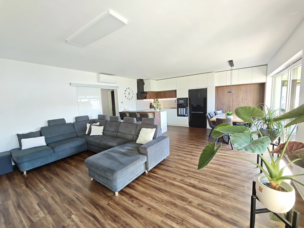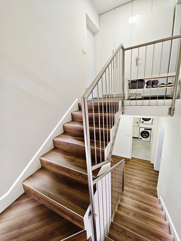 Stanovanje obsega pritličje in nadstropje in meri 218,50 m2 bruto ter 110,70 m2 neto površine. Vsaka etaža ima tudi svoj vhod. V pritličje se dostopa iz garaže, v nadstropje pa vodi samostojen vhod, ki ni vezan na večstanovanjski objekt. Stanovanje je vmesna enota med dvema večstanovanjskima objektoma, brez dodatnih stanovanj nad enoto, kar nudi dodatno zasebnost.